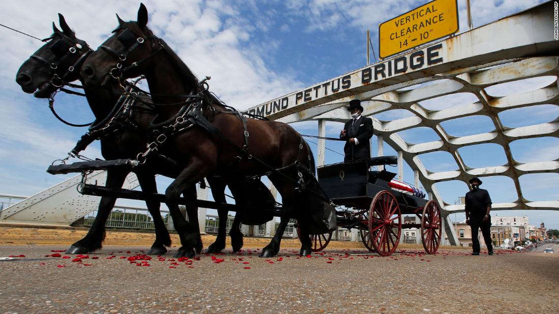 Following a short ceremony outside of Brown Chapel AME Church on Sunday, Lewis’ body traveled on a horse-drawn caisson through several blocks of downtown Selma to the Pettus Bridge, where Lewis’ flag-draped casket crossed.