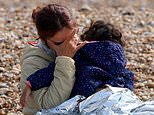 A migrant woman holds her head in her hands while clutching a child after arriving on Dungeness Beach in Kent today