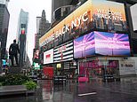 An abandoned Times Square on Saturday with a billboard welcoming people back to the city