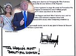 ‘Dear Mr. Trump, I would like to congratulate you and your colleagues on successfully holding the Miss Universe contest in Moscow. I hope that all the participants in this remarkable event will go home with good memories of their visit to the Russian capital,’ Putin wrote. ‘It is a pity that we were not able to have our meeting, but I hope we will be able to talk during one of your upcoming visits to Russia. Yours sincerely, V. Putin.