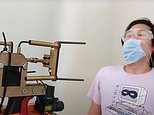 After mixed results with a mannequin’s head, Pan tried his mask gun on himself. He was able to launch the mask onto his nose and mouth without causing any bodily harm