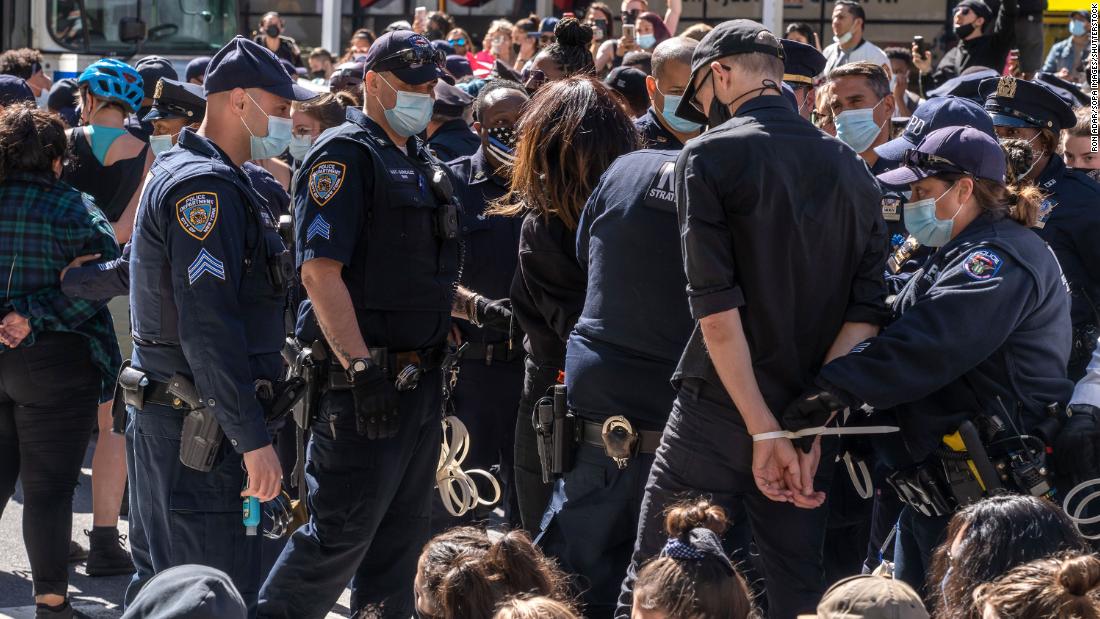 Video provided by Leyva but not verified by CNN shows protesters seated in Times Square as police try to secure their arms behind them, some being led away. A loudspeaker announcement says: “You are unlawfully in the roadway and obstructing vehicular traffic. You are ordered to leave the roadway and utilize the available sidewalk.”