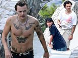 Harry Styles goes shirtless as he enjoys a dip in the pool and chats with a mystery woman while soaking up the sun on Italy’s stunning Amalfi Coast