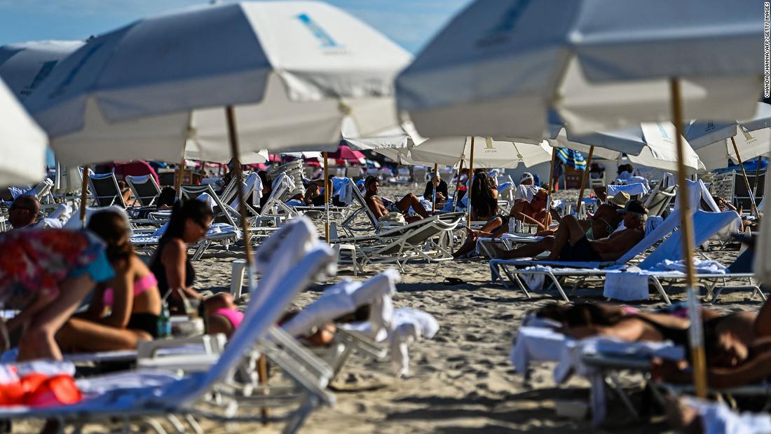 People relax on the beach in Miami Beach, Florida, on March 23, 2021