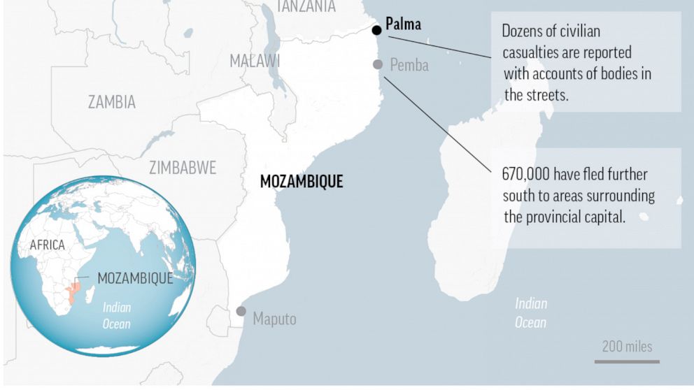 The battle for Palma highlights the military and humanitarian crisis in this Southern African nation on the Indian Ocean. The three-year insurgency of the rebels, who are primarily disaffected young Muslim men, in the northern Cabo Delgado province has taken more than 2,600 lives and displaced an estimated 670,000 people, according to the U.N.