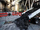 City of London Police arrested two protesters after safety barriers were placed around the rubble and placards stuck in the mound which read ‘we are the dead canaries’ and ‘do not insure the West Cumbria coal mine’.