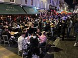 Pictured: Large numbers of people enjoy drinks in London’s Soho district, where tables and chairs have been set out on the roads