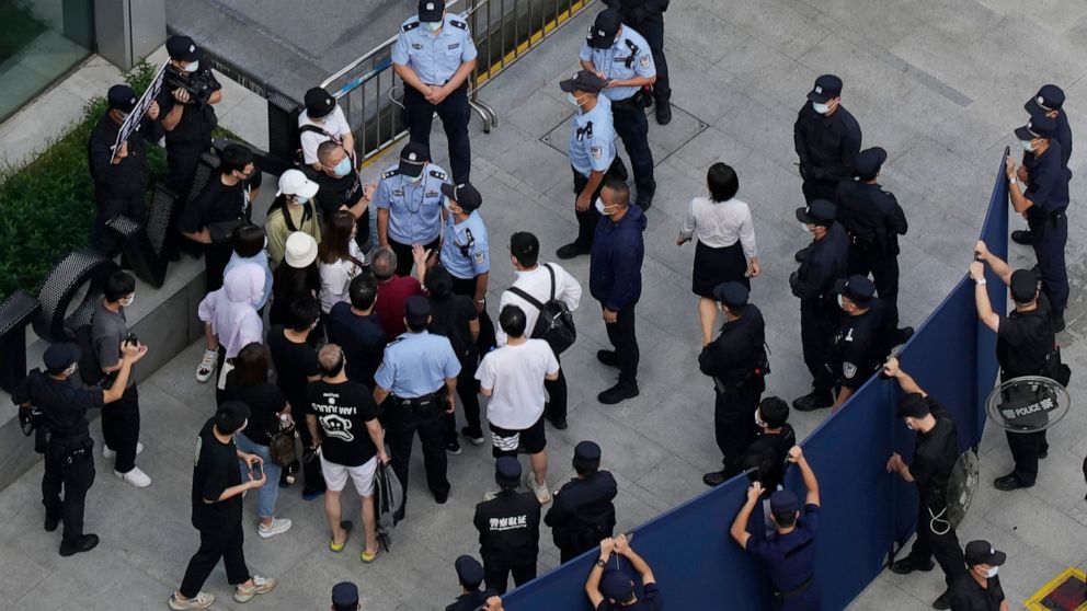 On Friday, investors in Evergrande debt who gathered at its headquarters in the southern city of Shenzhen said the company agreed to hold a phone meeting with them. Dozens of police officers with six vehicles stood guard outside the building.