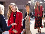 Carrie looked stylish in the red blazer emblazoned with gold buttons, matching it with a floral dress and low red slingback heels.