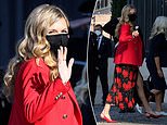 The first lady loves red: Earlier this month Carrie covered up her baby bump in a £360 red dress from a sustainable British brand as she supported husband Boris at his keynote speech at the Tory Party conference. Pictured, arriving at the venue