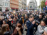 Few wore face coverings as they walked through the busy streets under the supervision of police. Some held signs saying ‘medical freedom’, while others flew the St George’s flag