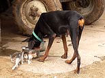 Paw-fect mother: Doberman adopts three orphaned KITTENS after losing her own puppies