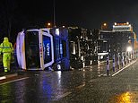 A lorry blown over in high winds blocks the A179 near Hartlepool, County Durham