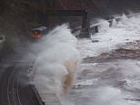 Huge waves crash into the seafront at Dawlish in Devon this morning as a train makes its way along the coastal railway