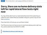 The Government’s website states it is not possible to order lateral flow testing kits for home delivery with a message stating: ‘Sorry, there are no home delivery slots left for rapid lateral flow tests right now.