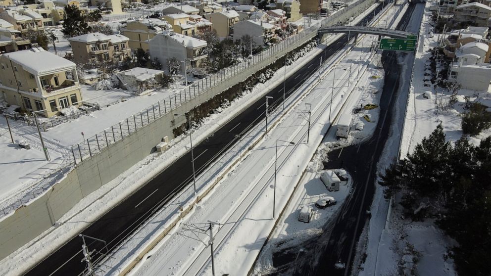 In Athens, rescue crews freed around 200-300 drivers who were trapped on a major highway that runs across Athens and connects the Greek capital with the city’s international airport.
