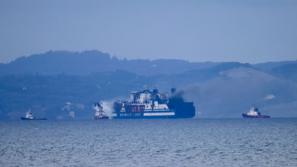 The ship is being slowly towed to the port of Kassiopi, in northeastern Corfu, by three tugboats, authorities said. Firefighters were still battling the blaze, which, although confined in certain spaces, reignites from time to time, and thick smoke is hanging over the ship.