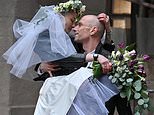 Ukrainian volunteer nurse and doctor celebrate their wedding by posing for photo on top of smashed-up car as they tie the knot in war-shattered Kharkiv