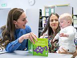 Kate Middleton, 40, showed off her motherly side as she cuddled a baby during storytime at a Glasgow school today as she joined Prince William on a two day whirlwind tour of Scotland