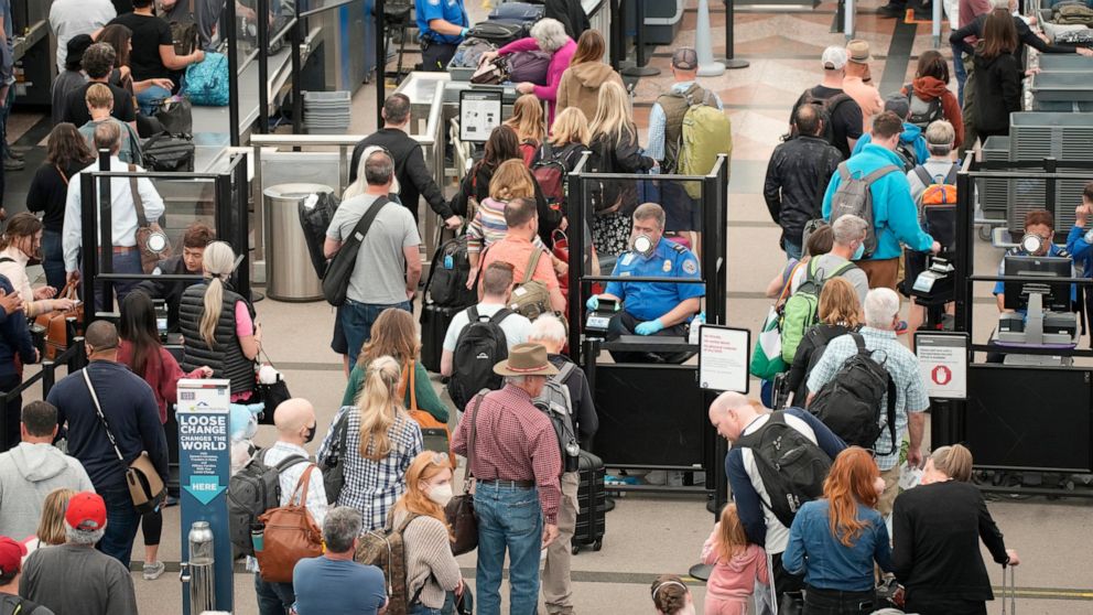 FILE – Travelers queue up move through the north security checkpoint in the main terminal of Denver International Airport, Thursday, May 26, 2022, in Denver. Airline travelers are not only facing sticker shock this Memorial Day weekend, the kick off to the summer travel season, but they’re also battling a pileup of flight cancellations. More than 1,000 flights were canceled as of Saturday afternoon, May 28, according to flight tracking website FlightAware, after 2,300 cancellations on Friday. (AP Photo/David Zalubowski, File)