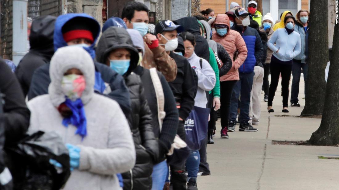 Hundreds impacted by the Covid-19 virus outbreak wait in line for boxes of food at a Salvation Army center in Chelsea, Mass.