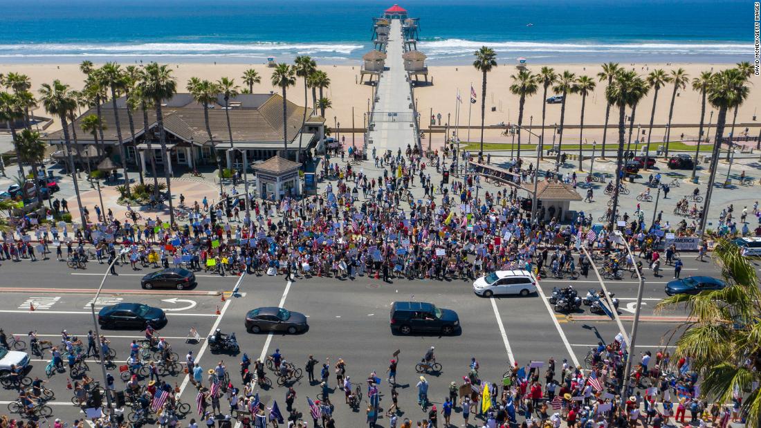 An aerial view shows a crowd of protesters calling to reopen businesses and beaches as the growing the coronavirus pandemic continues to cripple the economy in Huntington Beach, California Friday.