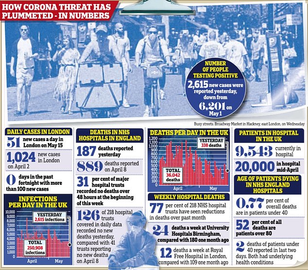 Official figures revealed on Thursday how deaths, hospital admissions and new infections have dropped significantly since the epidemic peaked in early April.