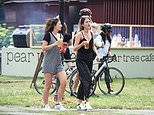 A woman carries a drink in a plastic cup as she walks through a packed Battersea Park with a friend this afternoon