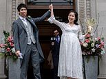 Gary Cheng and Sakiko Honda walk outside and celebrate after getting married at Marylebone Old Town Hall in London this morning. Wedding venues reopened today after having been closed for over three months during the pandemic