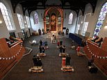 Tom and Heather during their wedding ceremony in Leeds, with guests seen socially distancing as the new relaxed rules mean couples can now say ‘I do’