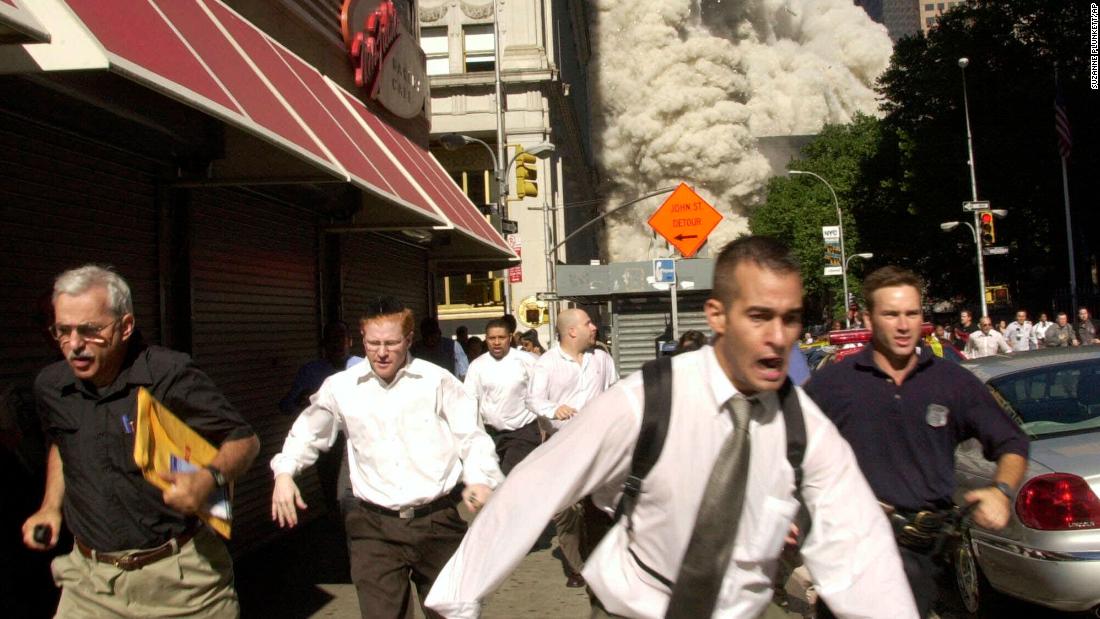 Dust-covered survivors run through New York’s streets after the towers collapsed.