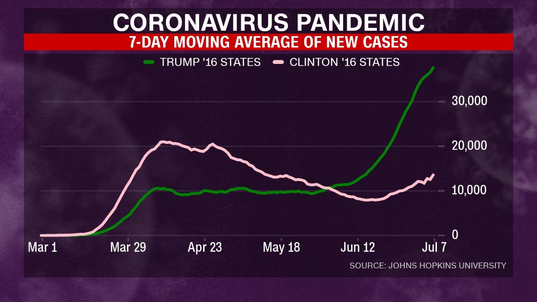 What’s most striking about Trump’s insistence that everything is fine, despite the resurgence of cases, is that it’s hitting states that voted for him.