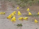 In the video a gaggle of yellow males is seen splashing around the flood waters, with fewer green females in sight.