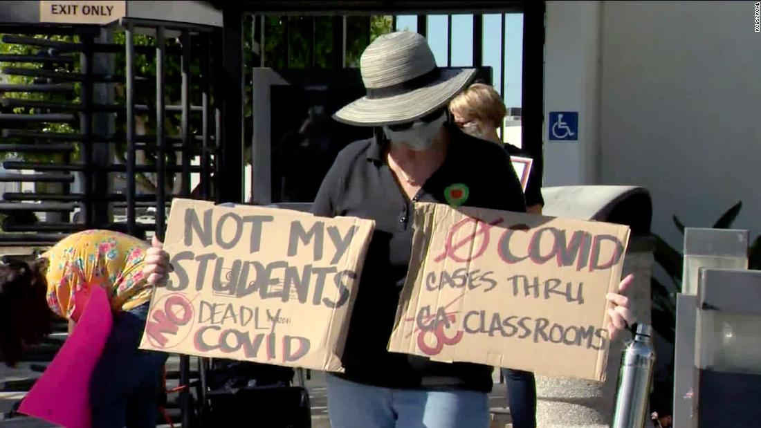 While some parents voiced their support to reopen schools during the board meeting, a group of parents and teachers gathered outside of the board’s meeting, protesting the idea of having kids return to school without masks or social distancing, according to CNN affiliate KCAL.
