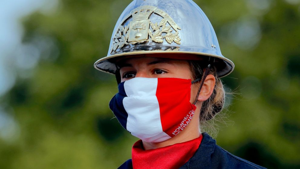 In Paris, a firefighter wore a face covering with the colors of the French flag before marching in the Bastille Day parade celebrating the national holiday this week along the Champs Elysees. Others at a protest across town wore yellow masks, representing the yellow vest movement against economic injustice that began in late 2018.
