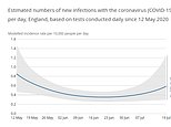 During the most recent week (12 July to 19 July), ONS estimates that around 2,800 people became newly infected with Covid-19 per day. It could be as low as 1,500 or as high as 5,500 based on their calculations.