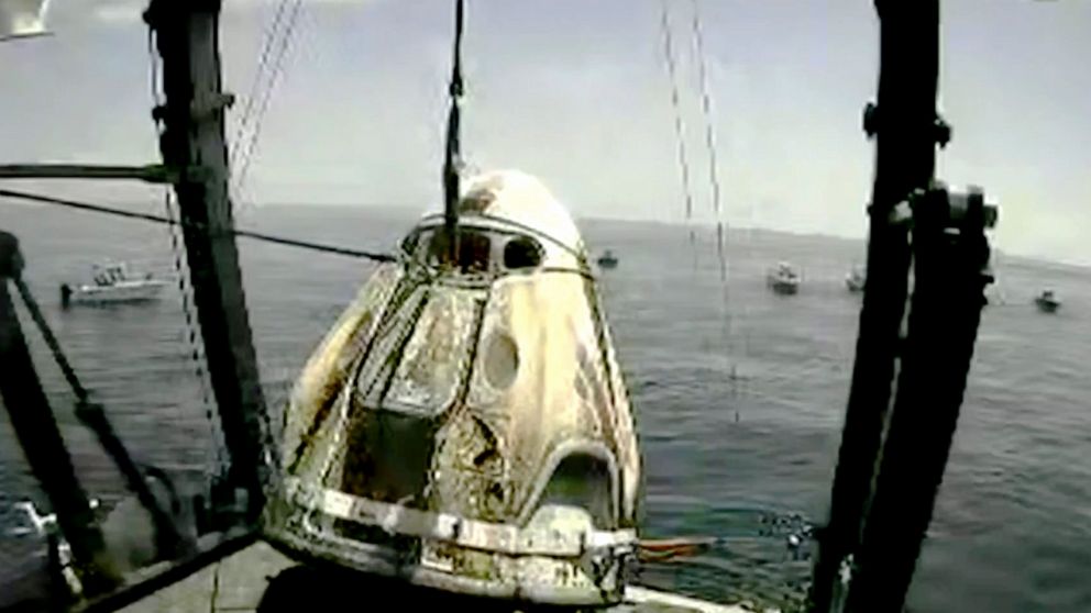 Within a half-hour of splashdown, the scorched and blistered 15-foot capsule was hoisted aboard a SpaceX recovery ship with a staff of more than 40, including doctors and nurses. To keep the returning astronauts safe in the pandemic, the recovery crew quarantined for two weeks and were tested for the coronavirus.