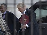 Boris Johnson, pictured arriving in Downing Street with his dog Dilyn this morning, is facing a Tory rebellion over his Brexit plans