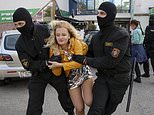 Police officers detain a woman wearing a face mask during an opposition rally in Minsk, Belarus, today. Officers blocked the women and began dragging them into police vans as they stood with linked hands