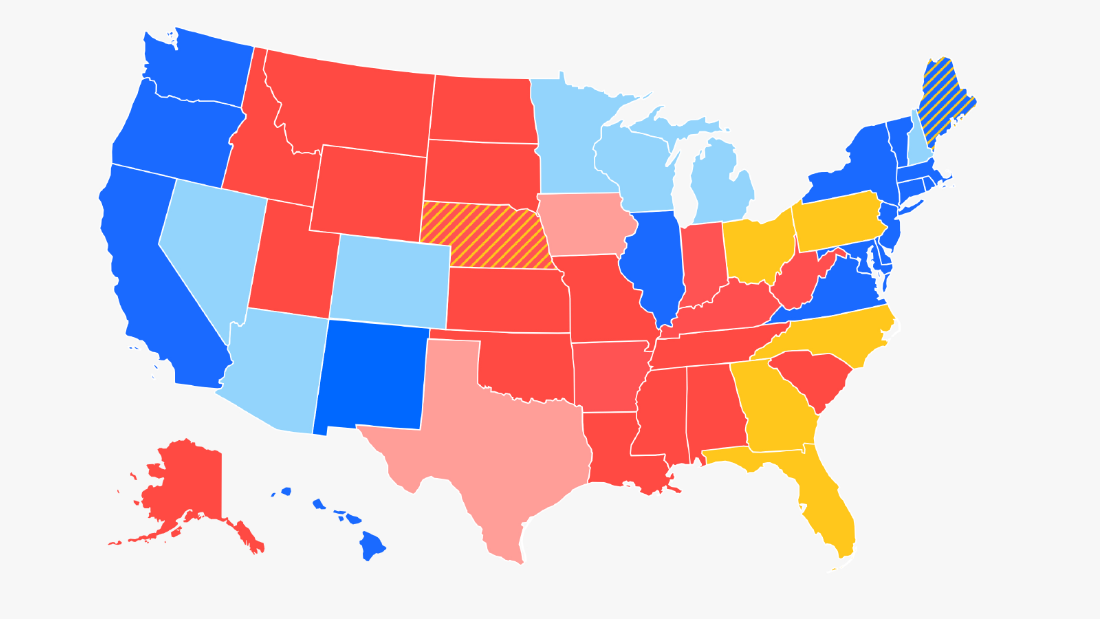 Florida (29), Georgia (16), Maine 2nd Congressional District (1), Nebraska 2nd Congressional District (1), North Carolina (15), Ohio (18), Pennsylvania (20) (100 total)