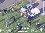 The aerial footage, shot by a police helicopter, shows a grey-track-suited man running at a group of police officers while carrying a petrol can.