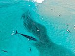 Having a whale of a time! Incredible drone footage shows the moment a pair of huge Bryde’s whales catch waves with surfers near Byron Bay