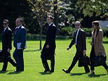 Hope Hicks (far right) is pictured walking to Marine One alongside Jared Kushner, center, to depart from the South Lawn of the White House in Washington DC on Wednesday
