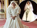 Blushing bride: Fans of The Crown have been given the first look at Princess Diana’s wedding dress for the upcoming fourth series. Left is Emma Corrin in the replica and right Princess Diana on her wedding day
