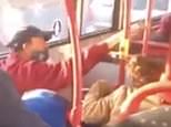 A male passenger jumps up and grabs the man and flings him backward down the bus. He says: ‘What are you doing you piece of sh*t? I will f**king murder you.’