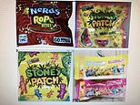 There have been ‘multiple’ reports of children eating cannabis infused sweets that are designed to look like real children’s sweets but have a ‘high’ THC content of 500mg. Pictured: ‘Nerd Rope Bites’, ‘Stoner Patch’ and ‘Stoney Patch’ sweets which are all illegal in the UK