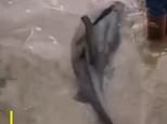 Heart-warming footage shows Chinese fishermen saving a dolphin stranded on a beach before releasing it back to the sea