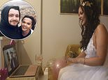 Augustina donned a lacy white gown with a gold crown for the virtual occasion with her beau (pictured)