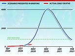 This slide presented on live TV on Saturday shows a projection of deaths hitting 4,000 per day by the end of December (blue line) but experts say they are ‘concerned’ about the decision to include this because it is based on old data that has since been updated