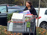 Pictured: Shoppers leave The Range in Watford with a trolley loaded with Christmas decorations